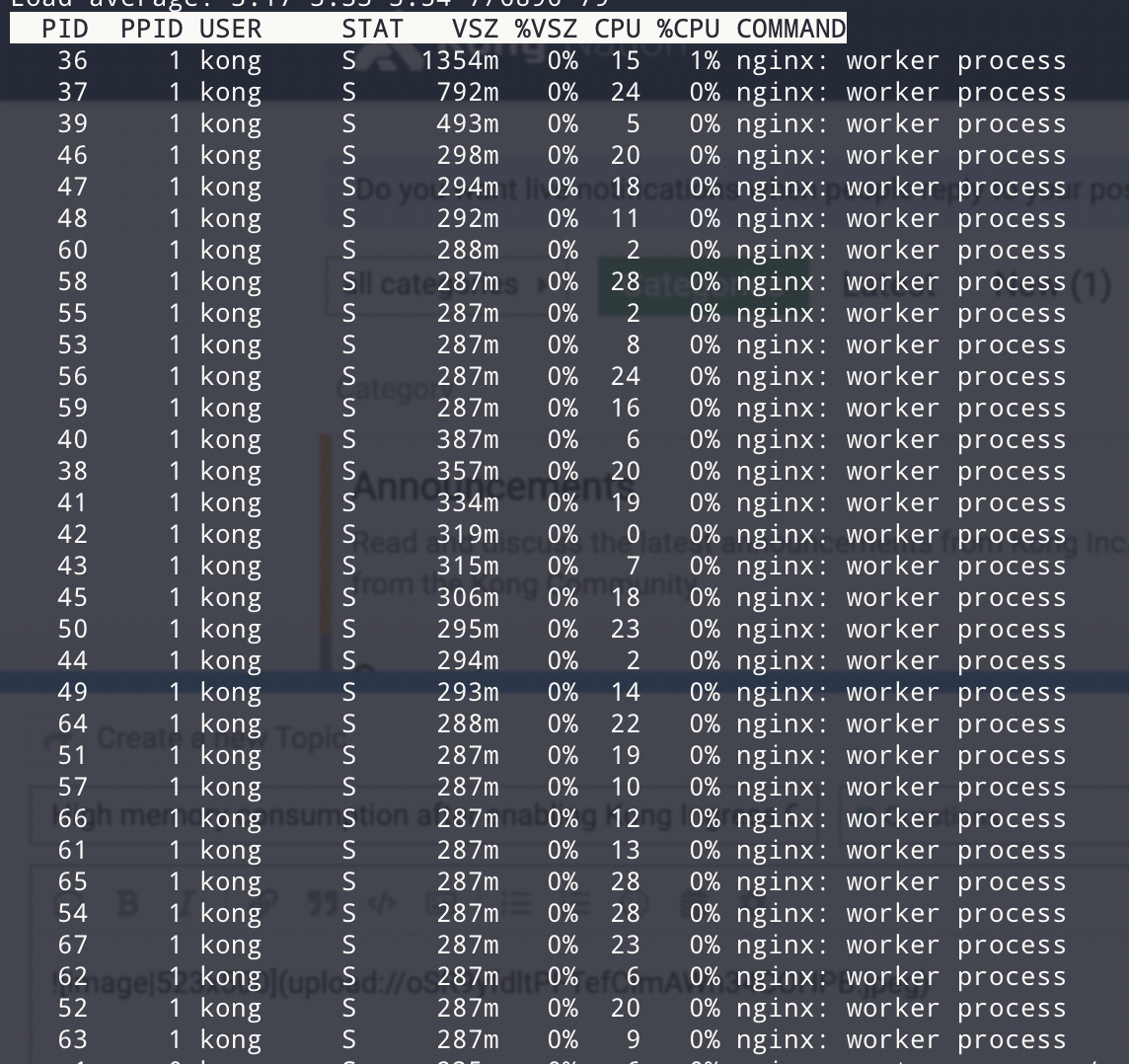We recently introduced Kong Ingress Controller into our dev env and it works fine. However, we noticed a much higher memory consumption on the kong pods and especially abnormal memory usage on the Nginx worker processes.